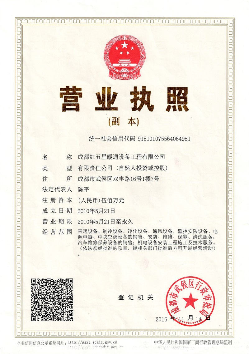 成都紅五星暖通設備工程有限公司營業(yè)執(zhí)照